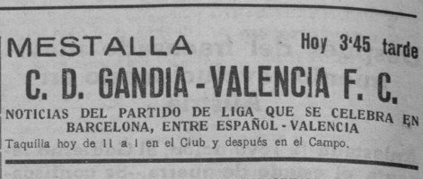 La mateixa setmana del partit davant el Barcelona el CD Gandia va disputar un altre amistós rellevant: el dia 18 de Gener de 1934, aprofitant que descansava al Campionat d’Espanya Amateur, l’equip visita Mestalla per a enfrontar-se els suplents del València, patint una mínima derrota per 2-1, amb gol inicial de Ramonet per als gandians. La crònica del diari «Las Provincias» elogia discretament els gandians, assegurant que «el partido ha sido poco interesante, dando las únicas notas de emoción el Gandia, que ha demostrado ser un equipo apañadito».