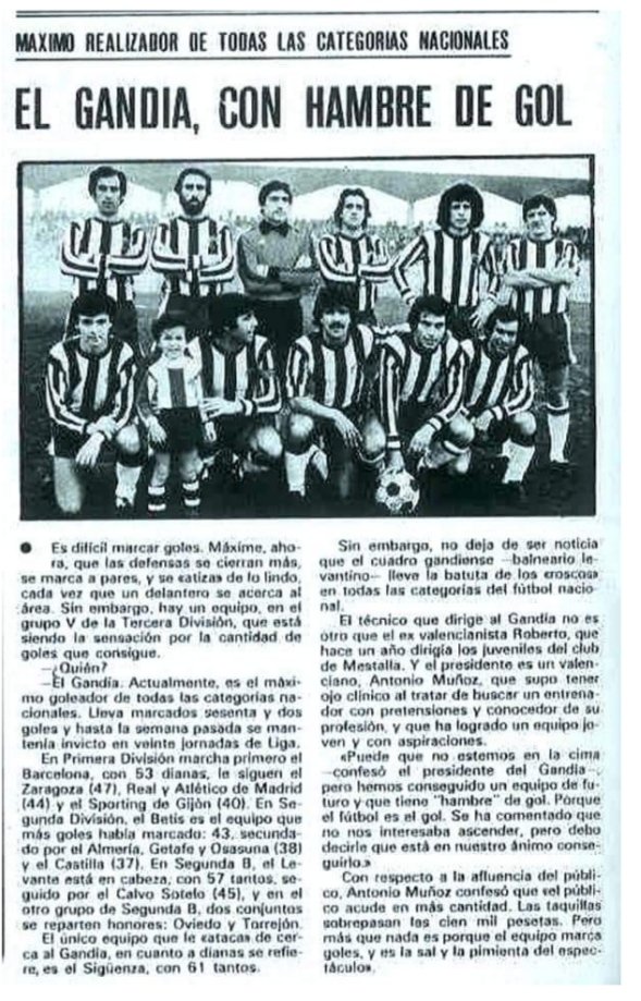 El Gandia es el equipo de moda y su buena temporada merece la atención del periódico Marca, que publica un artículo días antes del decisivo partido de Elda, en el que se destaca a los gandienses por ser el equipo más goleador del fútbol nacional con 62 goles y por su racha de imbatibilidad, que cumple por entonces los 20 partidos