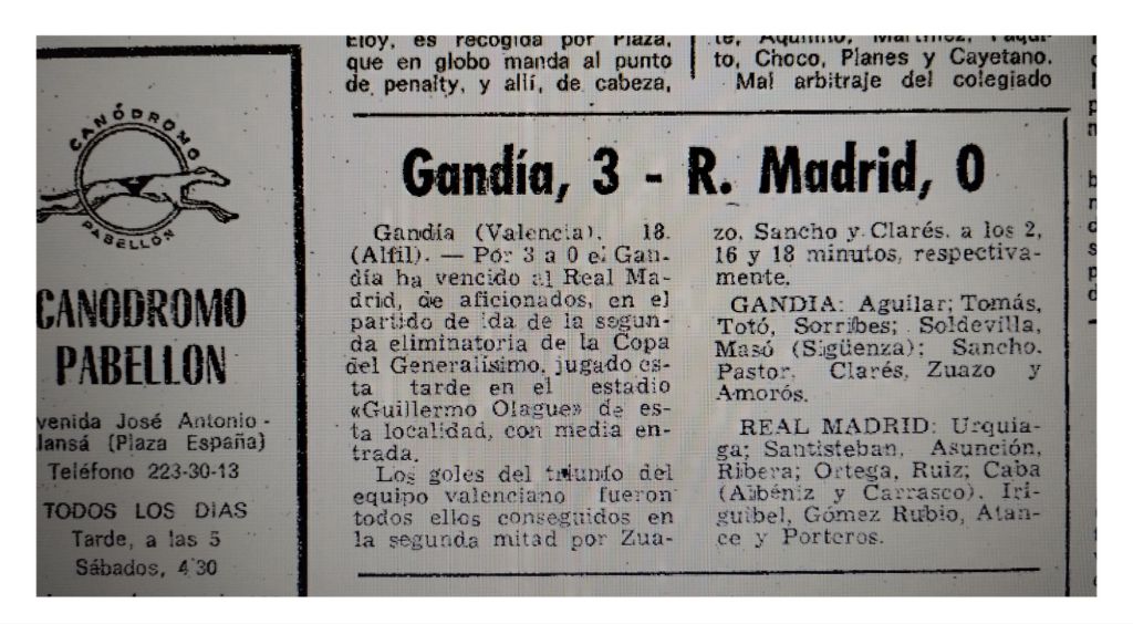* Superem dues eliminatòries. El Gandia elimina a la primera ronda de la Copa del Generalísimo el Portuense, després de remuntar al Guillermo Olagüe, amb un 4-0, el desaventatge de l’ anada al Puerto de Santa María (2-1). A la segona ronda el rival es el Real Madrid Aficionados, a qui s’ elimina per un apretat resultat global de 3-2 . Els gandians es classifiquen per a la tercera ronda on espera un equip de Segona Divisió…