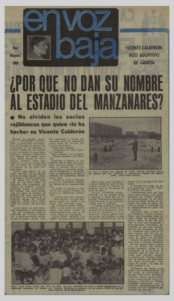 Cántabro de origen pero afincado en Madrid, Vicente Calderón era un empresario de éxito que desde principios de los 50 tenía su segunda residencia en la Playa de Gandia, donde realizó diversas inversiones que contribuyeron al desarrollo turístico de la ciudad. Calderón había recibido la distinción de hijo adoptivo de Gandia en agradecimiento a la obra benéfica realizada por la Fundación María de los Ángeles Suárez de Calderón, creada en 1964 en memoria de su mujer, fallecida prematuramente. La fundación fue la encargada de construir, en 1965, el colegio del mismo nombre, paliando el grave problema de recursos educativos que sufría el Grau de Gandia.