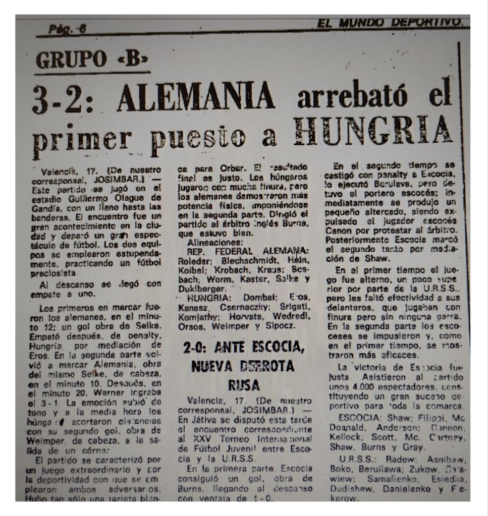 * Campionat d’ Europa a Gandia. En commemoració del 25 aniversari de la fundació del Club de Futbol Gandia, el Guillermo Olagüe es designat seu d’ un partit del Campionat Internacional UEFA Juvenil (Campionat d’ Europa sub-18). Es tracta del partit decisiu de la Primera Fase entre Alemania Occidental i Hongria. Guanyen els alemans per 3-2, classificant-se per a les semifinals. El partit desperta una gran expectació i l’ estadi gandià presenta un plé de gom a gom.