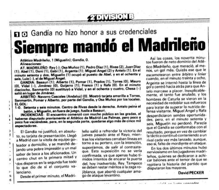 La foto de aquí abajo pertenece al partido At. Madrileño-Gandia del 21 de Septiembre. Estamos en 1986 y el verano da sus últimos coletazos…