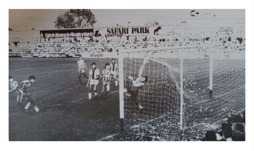 Pero hablando de cosas más importantes (ejem), la temporada 1986/87 se presentaba especialmente ilusionante para el CF Gandia. El equipo había ascendido, unos meses antes, a Segunda B, por primera vez en su historia, tras golear en un irrepetible partido al Maspalomas. El club afrontaba una campaña histórica, compitiendo en una categoría potentísima que había quedado reducida a un grupo único de 22 equipos, en el que teníamos como rivales a númerosos equipos históricos del fútbol español (Granada, Córdoba, Tenerife, Salamanca, Burgos…). Gandia respiraba un ambiente futbolístico de euforia y excitación desbordantes y el Guillermo Olagüe se llenaba cada dos domingos en partidos multitudinarios que eran una auténtica fiesta.