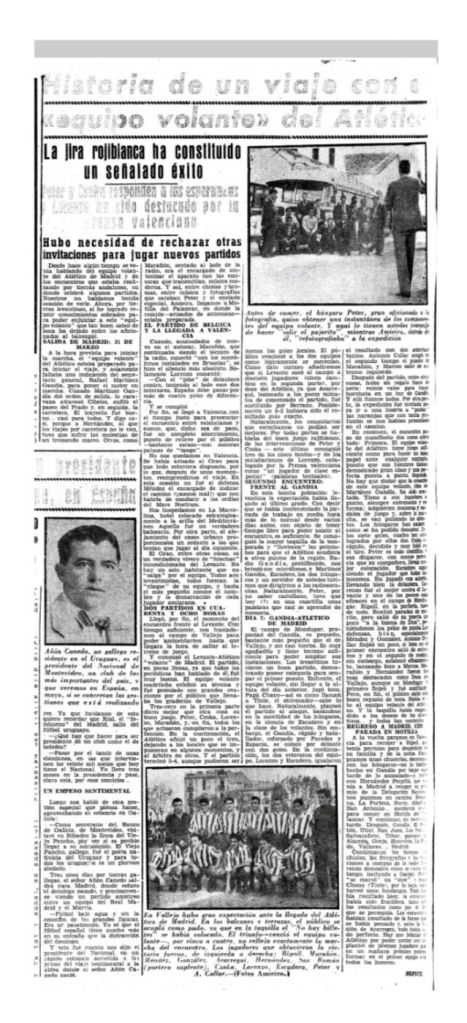 Ambos futbolistas son reclutados por el Atlético de Madrid en Enero de 1957 pero no pueden participar en partidos oficiales, limitándose a formar parte del denominado At.Madrid «volante», una suerte de equipo itinerante que disputa partidos amistosos por toda España. Uno de esos partidos, disputado el Martes 2 de Abril de 1957 en Gandia, en el marco de una mini gira por la provincia de València en la que disputaron, el día anterior, un partido ante el Levante en el campo de Vallejo, mereció una extensa crónica en las páginas del Diario Marca del 6 de Abril de 1957.