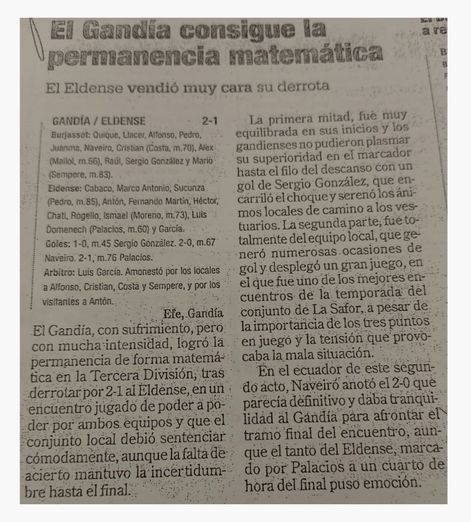 El fet d’ haver patit dues derrotes consecutives als dos anteriors partits de lliga, sumat a la desastrosa estadística com a equip local, estaven lluny de convidar l’ optimisme. Però la realitat és que el Gandia va eixir al terreny de joc amb una excel.lent disposició per aconseguir una victòria matemàticament salvadora, doncs, de forma sorprenent, el Castelló B (qué important va ser aquella victòria als despatxs!) havia perdut el seu partit, el dia anterior, davant el Santa Pola. El Gandia dominava el partit i multiplicava les seues ocasions davant l’ Eldense, aconseguint avançar-se al marcador mitjançant un gol de Sergio González al minut 45. Amb el marcador en contra l’ Eldense començava a estirar les seues línies i a posar en perill l’ avantatge gandià, però al minut 67, un baló rebutjat en la frontal de l’ àrea, lluny de la porteria rival, va ser recollit pel capità Jesús Naveiro, que engaltava una canonada espectacular que superava el porter visitant. Era el 2-0 que encarrilava el partit. El Gandia, finalment, guanyava per 2-1 i aconseguia la salvació a falta d’ un partit per a la fi del campionat.
