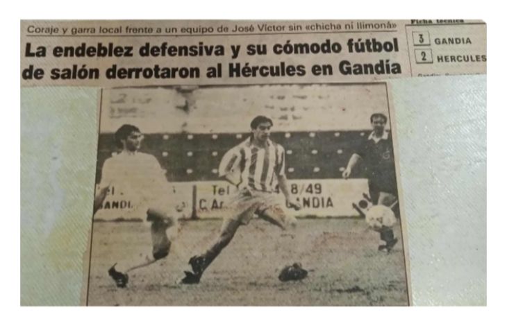El partido comenzó con dominio del Hércules, que trataba de resarcirse ante su afición de dos derrotas consecutivas que le habían costado el liderato. El Gandia, sin embargo, conseguía neutralizar los ataques herculanos gracias a una segura línea defensiva en la que destacaba un joven portero murciano de 1’95 de altura, futuro mito blanquiazul, que respondía al nombre de Espín. Entrenaba al Gandia otro murciano de peculiar carácter, José Víctor Rodríguez, un entrenador duro y exigente, que había confeccionado, con bastante menos dinero que el Hércules y el Orihuela, un equipo muy competitivo, dispuesto a pelear por el ascenso. Con el paso de los minutos el Gandia se deshacía del dominio local y comenzaba a lanzar contraataques cada vez más peligrosos. El Gandia de José Victor, en efecto, además de defender bien, era un auténtico puñal a la contra, especialmente cuando jugaba como visitante.