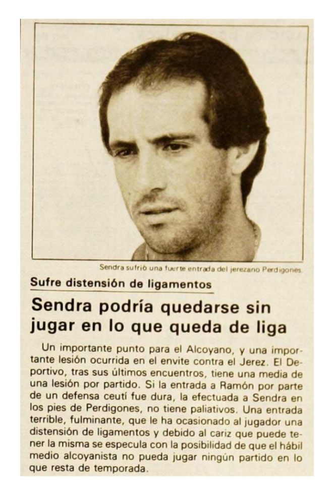 El 26 de Febrer de 1984 l’ Alcoyano, segón classificat, visita el camp del Xerez, quan al minut 73 de partit una forta entrada d’ un jugador rival provoca la desgràcia: Sendra pateix trencament dels lligaments interns i del menisc i diu adéu a la temporada. La lesió deixarà el pegolí fòra dels terrenys de joc durant 1 any. En la temporada 1984/85, després d’ un breu pas pel Pego buscant recuperar la seua forma, Benito Floro, entrenador del Gandia, el crida per tornar a jugar en la Ribera del Serpis.