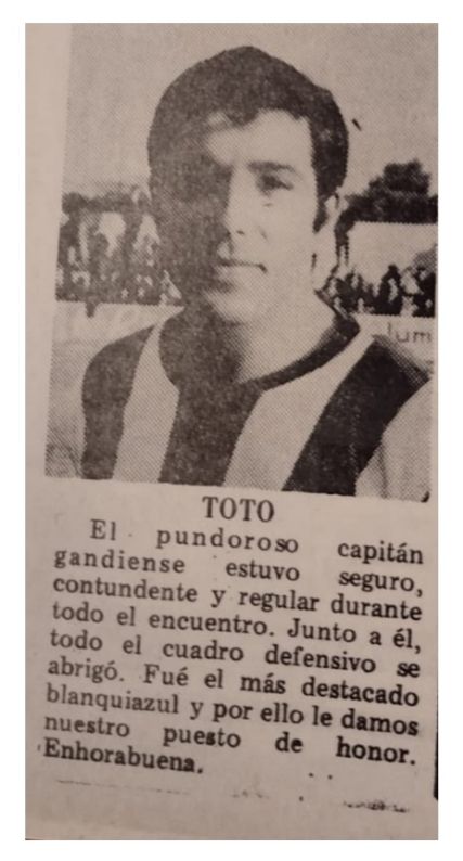 » Integrant del gran Gandia dels seixanta, un equip abonat a les primeres posicions de la Tercera Divisió, i de la quinta de grans jugadors gandians de la època (Maso, Pallarés, Soldevila…) Totó, un dels millors defenses de la història del club, va jugar nou temporades consecutives amb el primer equip del Gandia i disputà dues promocions d’ ascens a Segona Divisió».