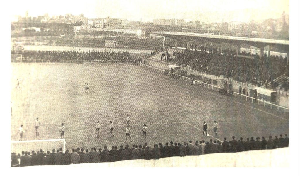 1955/56. Les Corts (Barcelona). Partit de desempat de la promoció d’ ascens davant el Real Mallorca. Bonet, especialista de l’ equip, llança un penal amb el seu característic golpeig de puntera. En aquesta ocasió el xut eixirà per damunt del travesser. No obstant això, el Gandia s’ imposarà per 3-1 i aconseguirà la classificació per a la següent ronda. (Fotografia Diari Baleares).