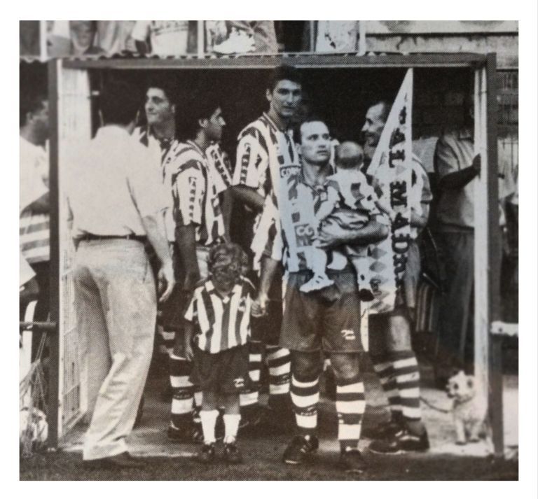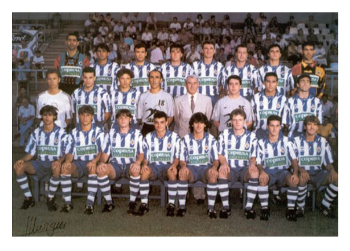 AL MIG: Paquito (utiller), Mauro Fanari, Gomar (Preparador Físic), Medina (Entrenador), Liduvina Gil (Regidora d’ Esports), Santandreu (President), Pedro Herraiz (Segón Entrenador), Ignacio Català (Segón Entrenador), Dani Bodí (Fisioterapeuta), Rigo (Utiller) i Ximo (Utiller).
