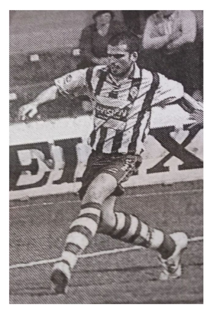 JUAN CARLOS Ferrando (de blanc, amb la samarreta de l’ Hércules) posa rodejat d’ Alberto i Carlos, ex companys del Gandia. Juan Carlos és el més jove dels germans Ferrando, que completen César i Paco, i arriba a Gandia procedent del Tavernes amb 19 anys. Migcampista talentós, va jugar 2 temporades amb l’ equip blanc-i-blau (1984-1986), aconseguint l’ històric ascens a Segona B. Després de brillar al Gandia va ser traspassat a l’ Hércules (Segona A), jugant posteriorment amb elLevante, Albacete (amb el que va debutar a Primera Divisió de la mà de Benito Floro en la temporada 1991/92) i Villareal. * Clàssic en la Copa. El sorteig de Copa va oferir un enfrontament molt atractiu davant un rival clàssic com l’ Alcoyano (Segona B). Els gandians van aconseguir un valuós empat a 2 gols al partit d’ anada disputat al Guillermo Olagüe, en un partit on l’ argentí Gilé va aconseguir 2 gols que avançaren els visitants, abans que Juan Carlos i Pomar (aquest al minut 90), aconseguiren els gols de l’ empat final. Al partit de tornada, a El Collao, és va produir una curiosa anècdota: la directiva alcoianista no va permetre al Gandia la entrada d’ una càmera de video utilitzada pel técnic gandià Benito Floro per grabar els partits. A Alcoi, el Gandia va fer un partit valent, avançant-se al marcador mitjançant un gol de Luis Forques. Però els locals van mostrar la seua superior categoria capgirant el marcador en la segona part amb un 5-1. El marcador seria maquillat pels gandians Montaner i Santi, amb dos gols que tancaren el marcador amb el 5-3 final, que donà la classificació a l’ Alcoyano.